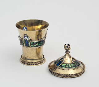 [Item, a tall, gold cup, in the English fashion, embossed with large leaves]