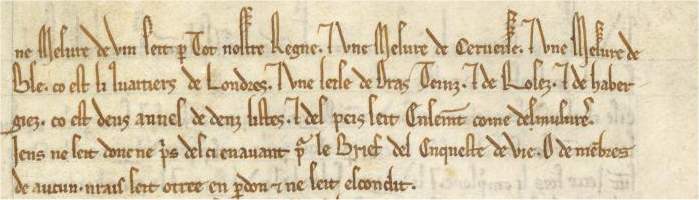 [U]ne mesure de vin seit par tot nostre regne, e une mesure de cerveise, e une mesure de
