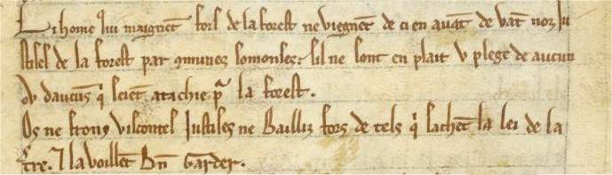 Men who live outside the forest shall not come henceforth before our forest justices by general summons, unless they are party to the plea or are standing pledge for someone or some people who have been detained because of the forest.